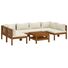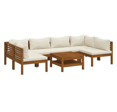 Având un cadru din lemn masiv de acacia, setul cu canapea este rezistent, robust și durabil, iar finisajul său cu ulei face ca acest set să fie potrivit pentru utilizarea în exterior. Pernele detașabile sunt căptușite în strat gros, astfel încât să ofere un confort deosebit. De asemenea, este inclusă o măsuță de cafea, cu un design original cu șipci. În plus, deoarece setul se distinge prin designul modular, toate piesele pot fi aranjate și personalizate după necesități.