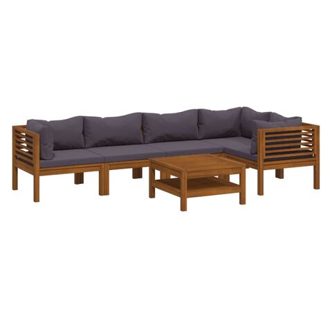 Având un cadru din lemn masiv de acacia, setul cu canapea este rezistent, robust și durabil, iar finisajul său cu ulei face ca acest set să fie potrivit pentru utilizarea în exterior. Pernele detașabile sunt căptușite în strat gros, astfel încât să ofere un confort deosebit. De asemenea, este inclusă o măsuță de cafea, cu un design original cu șipci. În plus, deoarece setul se distinge prin designul modular, toate piesele pot fi aranjate și personalizate după necesități.