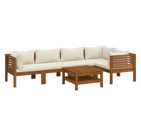 Având un cadru din lemn masiv de acacia, setul cu canapea este rezistent, robust și durabil, iar finisajul său cu ulei face ca acest set să fie potrivit pentru utilizarea în exterior. Pernele detașabile sunt căptușite în strat gros, astfel încât să ofere un confort deosebit. De asemenea, este inclusă o măsuță de cafea, cu un design original cu șipci. În plus, deoarece setul se distinge prin designul modular, toate piesele pot fi aranjate și personalizate după necesități.