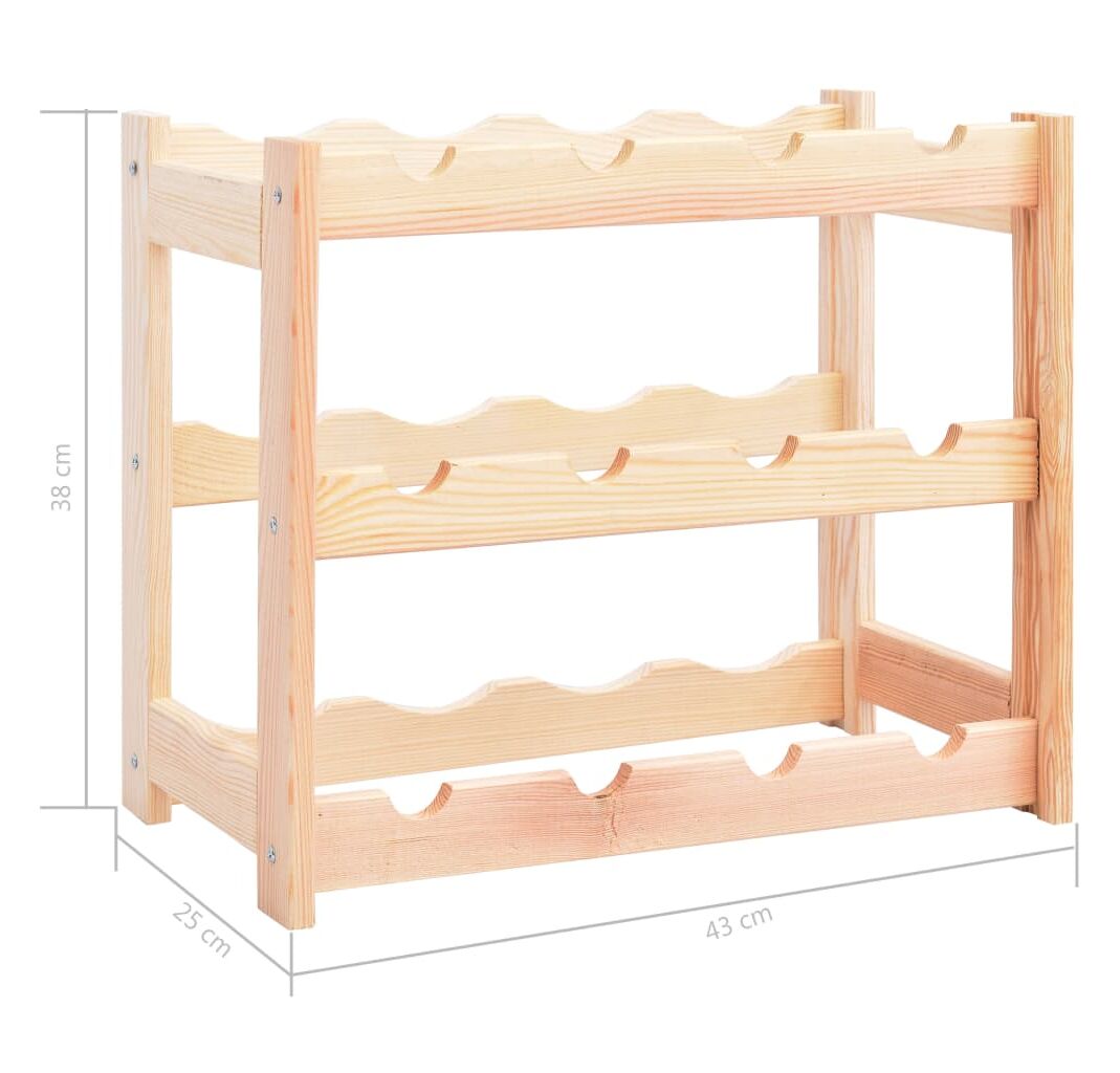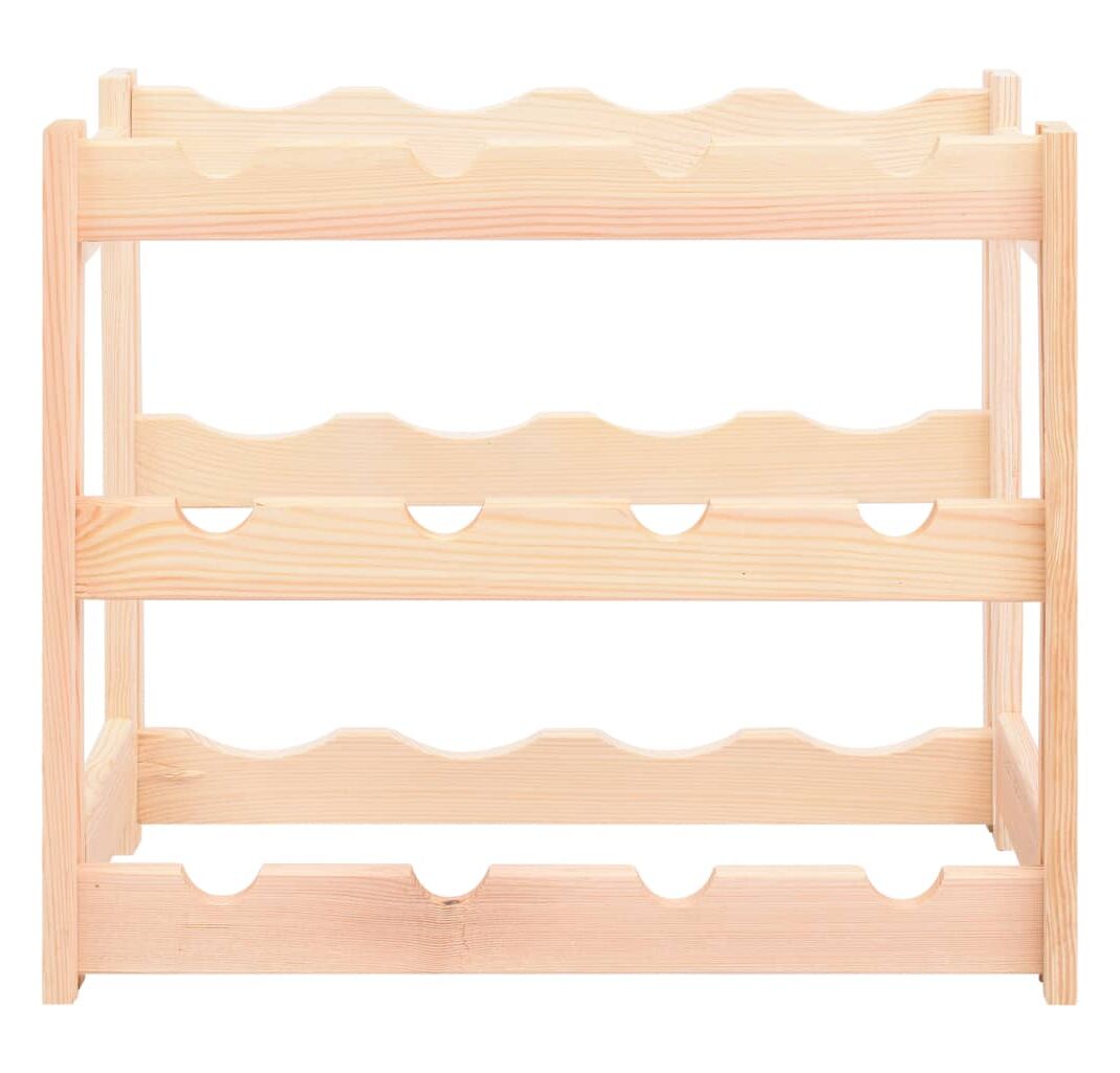 Suportul de vin susține până la 12 sticle de vin. Fabricat din lemn masiv de pin, este extrem de rezistent! Puteți să îi păstrați culoarea naturală sau să îi aplicați un strat de vopsea ori alt finisaj în culoarea preferată. Datorită materialelor de montaj incluse, suportul nostru pentru vin este ușor de asamblat.