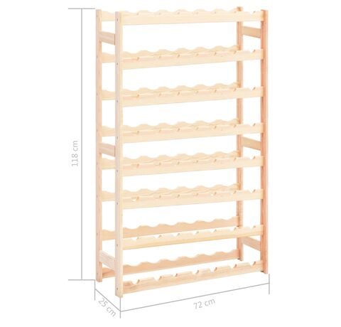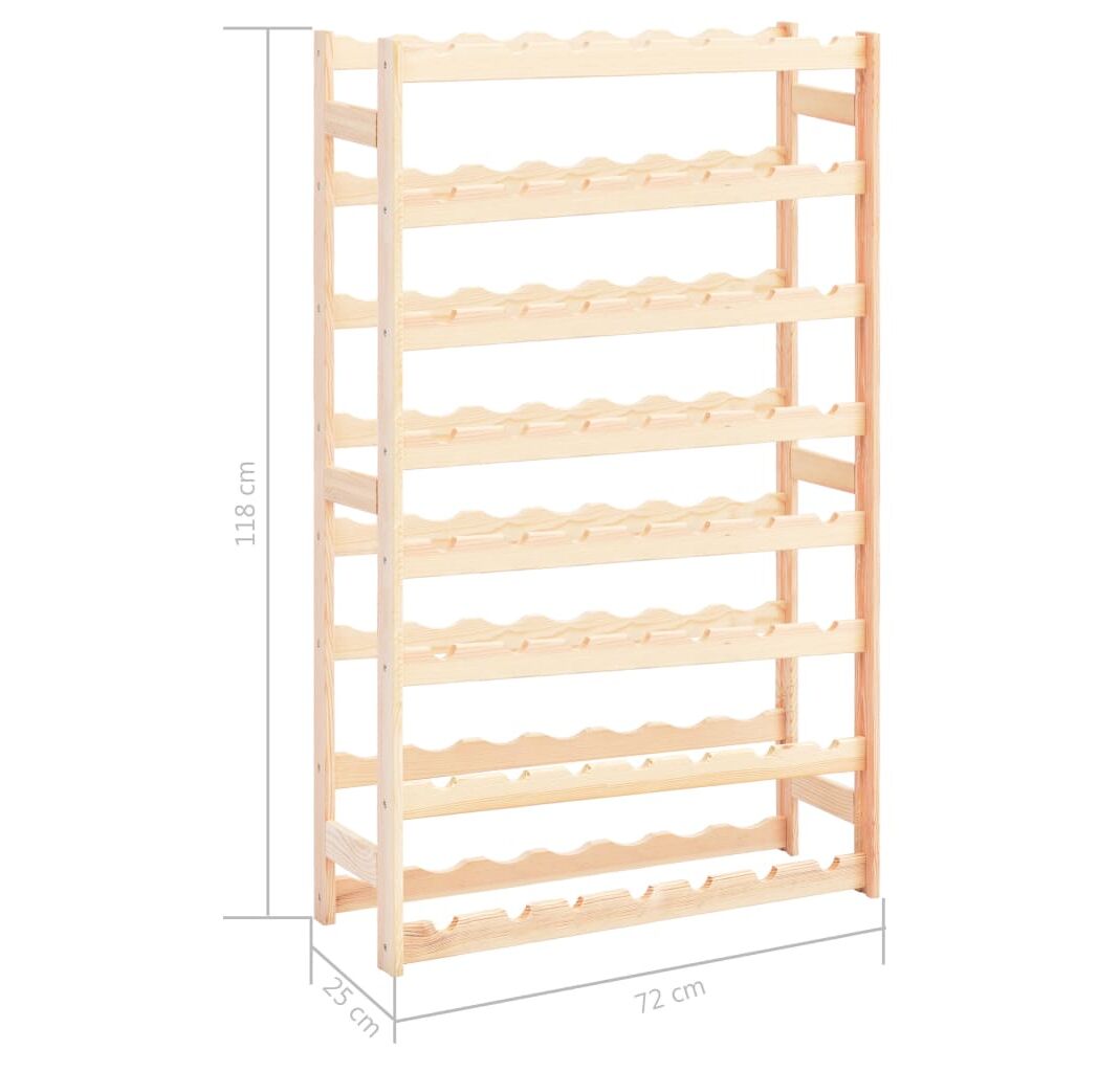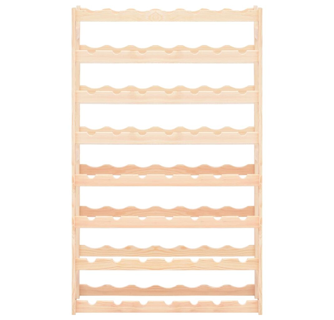Suportul de vin susține până la 56 sticle de vin. Fabricat din lemn masiv de pin, acesta este extrem de rezistent! Puteți să îi păstrați culoarea naturală sau să îi aplicați un strat de vopsea ori alt finisaj în culoarea preferată. Datorită materialelor de montaj incluse, suportul nostru pentru vin este ușor de asamblat.