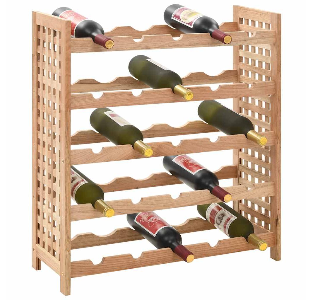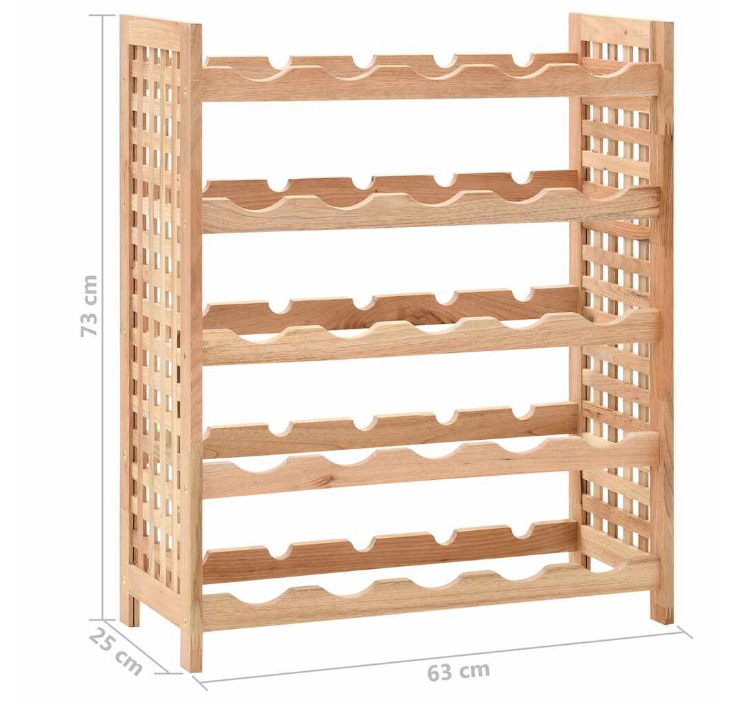 Suportul de depozitare pentru sticle de vin, fabricat din lemn, are cinci rafturi și poate păstra până la 25 de sticle de vin. Laturile sunt formate din cadrul frumos, care menține vinul ventilat, oferind în același timp raftului de sticle de vin un aspect elegant. Suportul compact și elegant pentru sticle se va potrivi perfect cu decorul dumneavoastră interior.