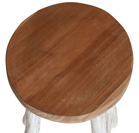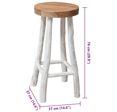 Scaunul de bar are o construcție solidă din tec, ceea ce îl face stabil și foarte durabil. Granulația frumoasă a lemnului face fiecare dintre scaunele noastre de bar unice și ușor diferite una de cealaltă. Picioarele au o formă curbată, ceea ce evidențiază designul rustic.