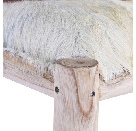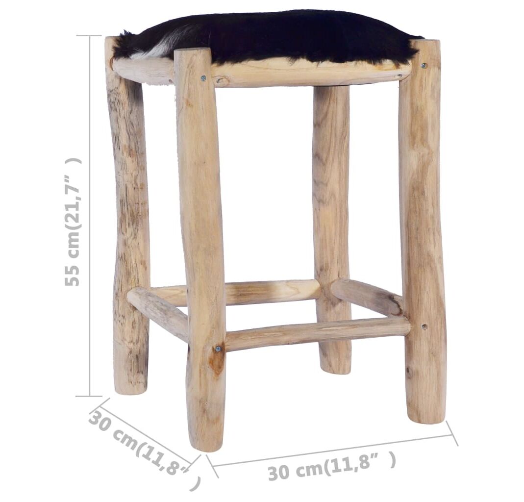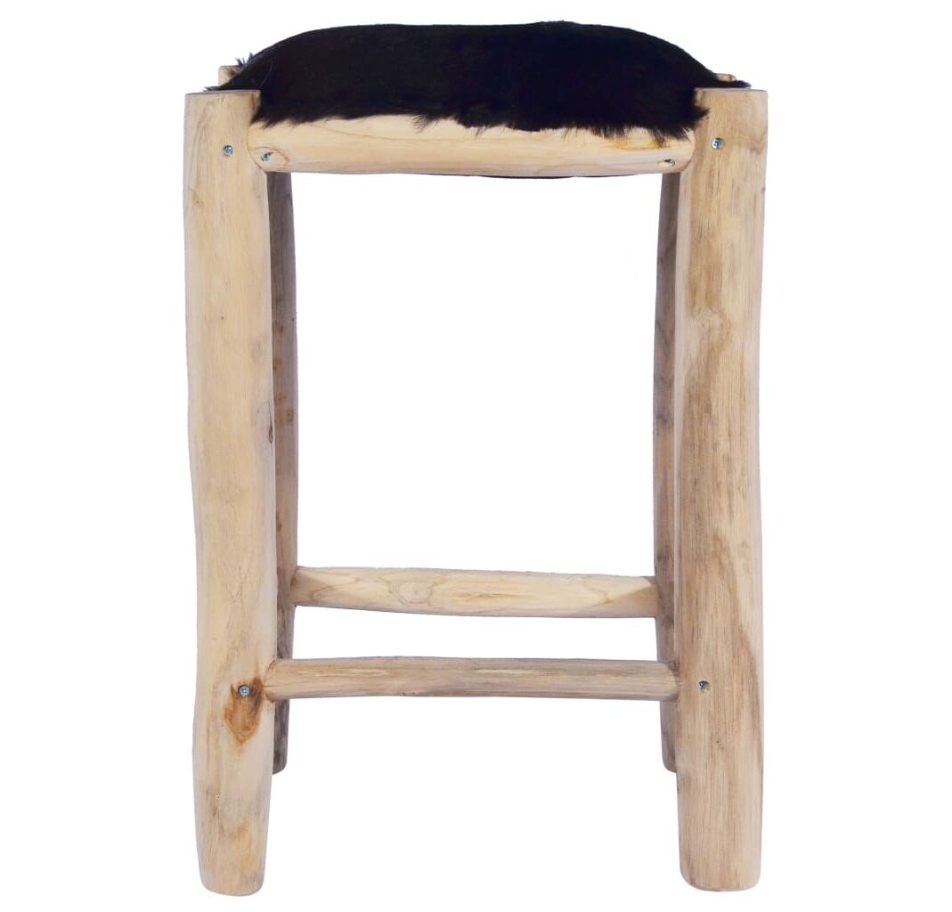 Scaunul de bar are un cadru din lemn de tec masiv, ceea ce îl face stabil și durabil. Șezutul este tapițat cu piele de capră 100% autentică, fiind astfel moale la atingere și confortabil. Modelul natural de piele face ca fiecare piesă să fie unică și ușor diferită de următoarea.