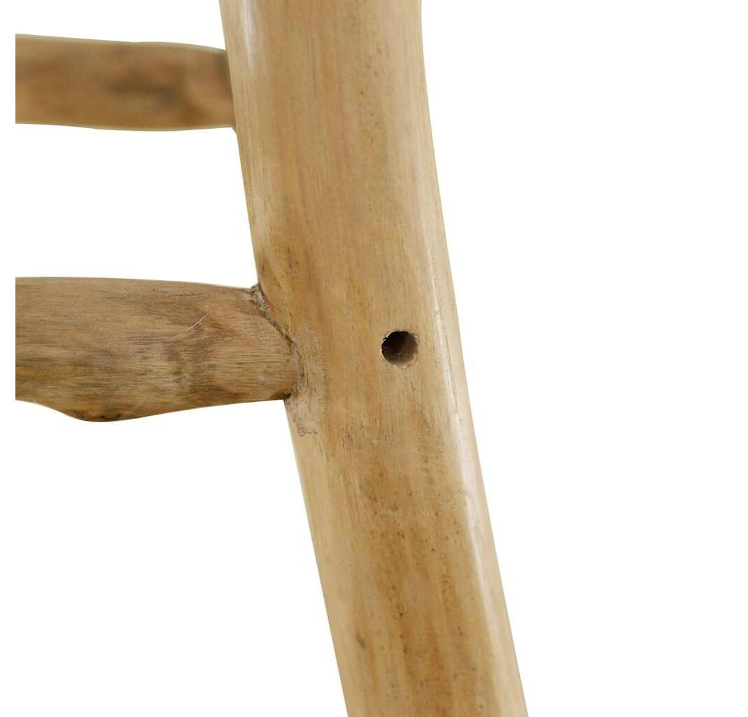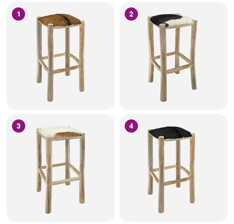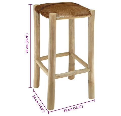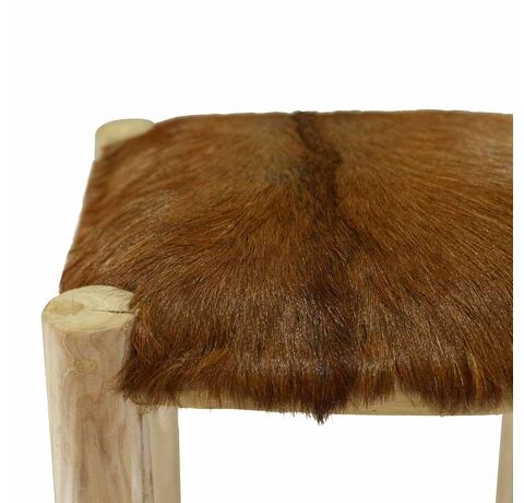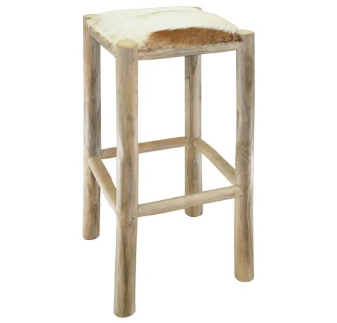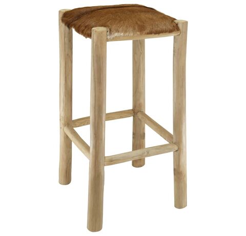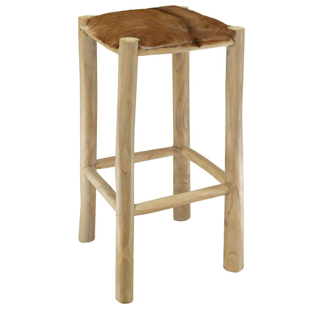 Taburetul de bar are un cadru solid fabricat din lemn de tec, fiind stabil și foarte durabil. Șezutul este căptușit 100% cu piele naturală de capră, confortabilă și durabilă, cu model de piele de vacă. Pielea blănoasă de capră este moale la atingere și confortabilă. Datorită modelului frumos al pielii naturale, fiecare dintre scaunele noastre este unic și ușor diferit de celelalte. Mulțumită căptușelii moi a șezutului, vă veți bucura de un confort optim când vă veți așeza. Picioarele au culoarea naturală a lemnului și îmbogățesc farmecul rustic al scaunului.