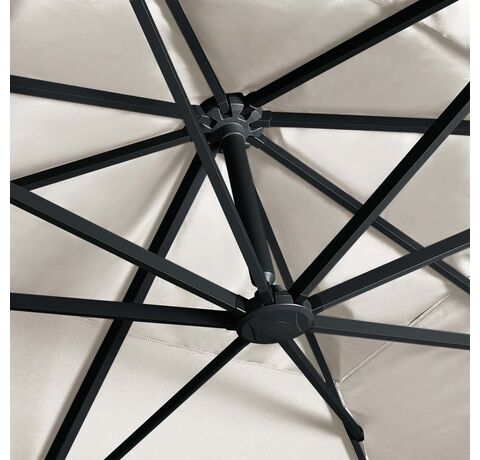 Fabricată din poliester cu protecție UV și anti-decolorare, cupola umbrelei de soare vă oferă protecție optimă împotriva soarelui și este ușor de curățat. Este prevăzută cu 24 de leduri solare, pentru a ilumina automat spațiul de exterior și pentru a crea o ambianță intimă și romantică, când apune soarele. Are o bază solidă încrucișată pentru a adăuga stabilitate. Umbrela de grădină poate fi deschisă și închisă cu ușurință prin rotirea mânerului de pe stâlp. Unghiul cupolei poate fi reglat prin apăsarea și tragerea mânerului în sus și în jos. Stâlpul central poate fi rotit la 360 de grade prin intermediul unei pedale. Stâlpul robust din aluminiu vopsit electrostatic și cele 8 spițe durabile asigură stabilitate și durabilitate umbrelei de soare. Produsul este ușor de asamblat.